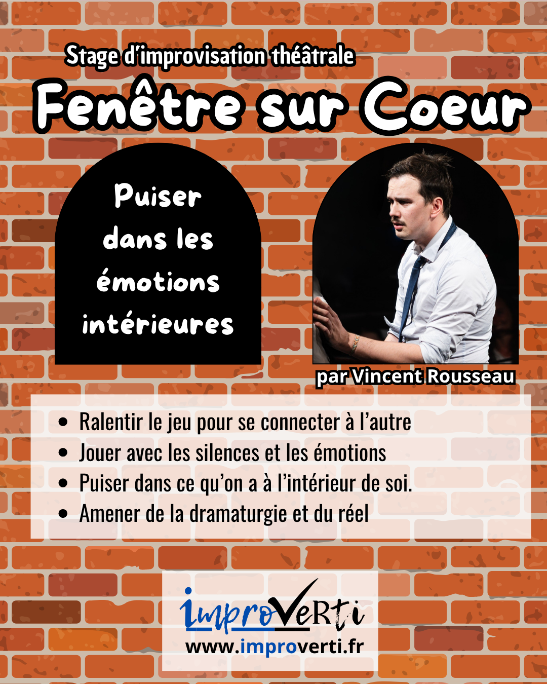 Je propose différents stages thématiques d’impro à la demande sur 1 ou 2 jours, qui sont plutôt pour des improvisateurs intermédiaires (1 à 4 ans d’impro) mais qui peuvent aussi s’adapter à des néophytes ou à des comédiens avancés.
